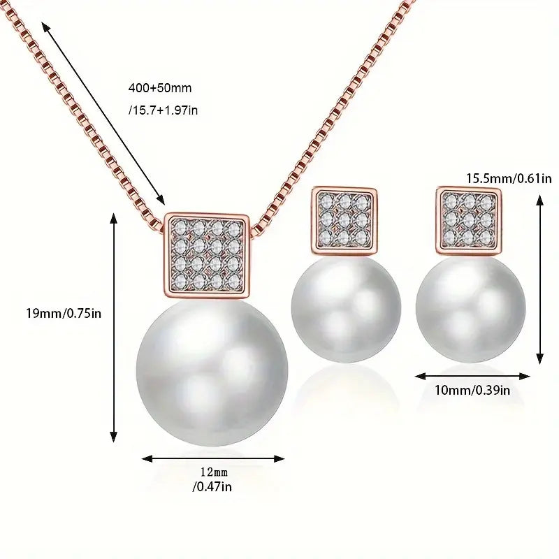 Elegant 2-piece jewelry set featuring an imitation pearl necklace with a square rhinestone pendant and matching stud earrings. Perfect gift for birthdays, parties, holidays, moms, and girlfriends.