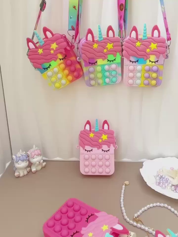 Fun and colorful unicorn-shaped silicone crossbody bag for kids. Features a secure zipper, multiple compartments, and an adjustable strap—perfect for school, playtime, or everyday use.